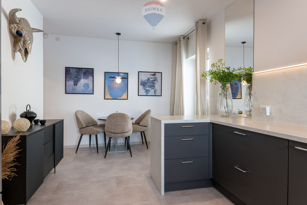w pełni wyposażona kuchnia z meblami w zabudowie oraz sprzętem AGD