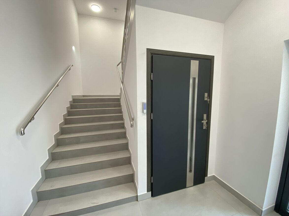 Szerokie korytarze: Ciągi komunikacyjne spełniają wymogi dla obiektów użyteczności publicznej, umożliwiając swobodne poruszanie się na wózkach.